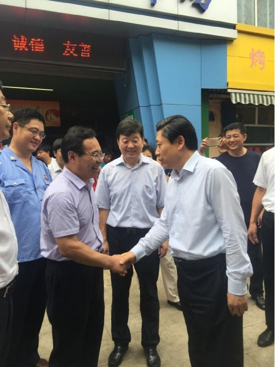市委王艺华书记亲临市场一线检查指导工作,与市工商局局长杨福雪同志亲切交谈。